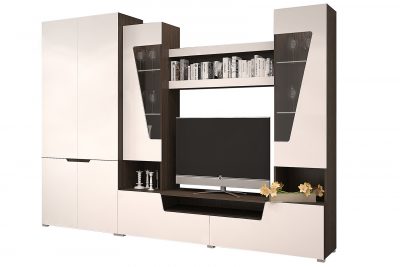 Дизайнеры снабдили витрину гостиной красивой распашной дверцей с вставкой из прозрачного стекла и стеклянными прозрачными полками. Стеклянные полки можно дополнительно укомплектовать подсветкой (которая приобретается отдельно). Телевизионная тумба – универсальной сборки. Отсутствие ручек – еще одна особенность серии «Анталия». В состав гостиной «Анталия» входит вместительный шкаф, а добавив комод можно получить еще больше места для хранения.