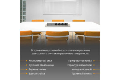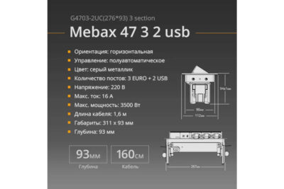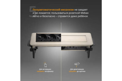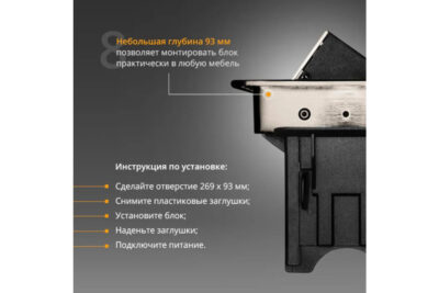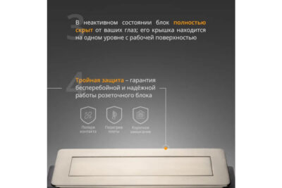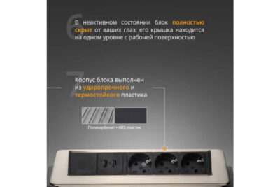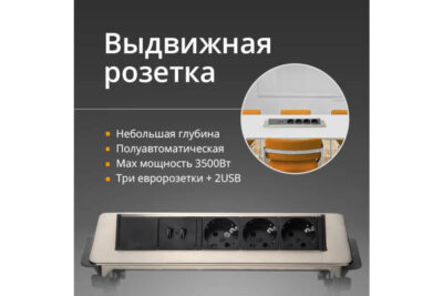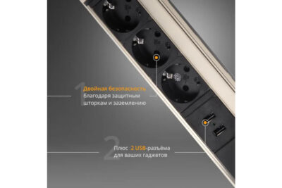 Это полуавтоматический блок розеток. Он открывается нажатием на крышку. Устройство удобно в использовании благодаря возможности заряжать телефон через встроенный разъем USB. Устройство не займет много места благодаря небольшим габаритам (319х93 мм). Габариты выреза: 192х92 мм. Напряжение: 250 В.