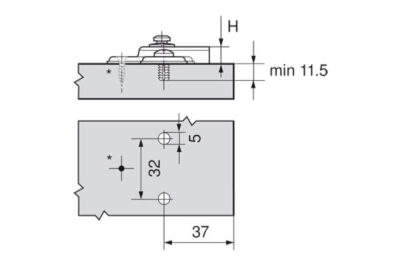 Система ответных планок: MODUL Форма ответной планки: крест. Подъем: 0 мм. Материал: сталь. Поверхность: никелиров. чашки петли: EXPANDO (с вмонтированными спецшурупами с распорн. пробками) Расстояние от переднего края каркаса до 1 позиции крепления: 37 мм Диаметр крепежных отверстий: 5 мм Глубина сверления крепежных отверстий: 11.5 мм Регулировка по высоте ответной планки: С продольным пазом.