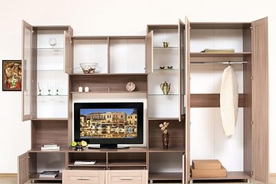 Габариты: ширина – 240 см; глубина – 44,6 см; высота – 205 см; размер ниши под ТВ – 103 х 75 см.