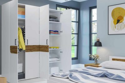 Как мы видим, шкаф «Милана» имеет белый корпус. Снабжен отделением с полками для белья, также штангой для верхней одежды.