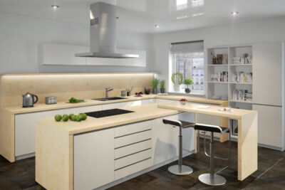 В качестве покрытия мебельного щита применен высокопрочный пластик (вид CPL). Так как стеновая панель выполнена под имитацию – натуральный камень, то на такой кухне вам и вашим гостям всегда будет тепло и по-домашнему уютно.