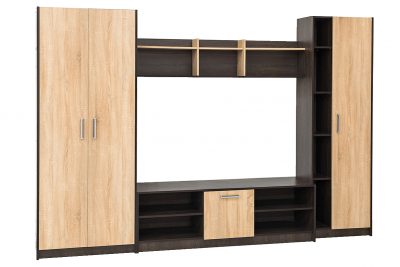 Это функциональное изделие обладает большим количеством полочек, секций и шкафов, является очень объемным и вместительным. Стенка содержит: платяной шкаф с верхней полкой, пенал с открытыми и закрытыми полками, открытые полки над нишей под ТВ и тумбу с открытыми полками и закрытым шкафчиком с дверкой.