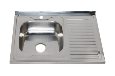 S8060L-1P — одночашевая накладная, прямоугольная мойка из нержавеющей стали, 80х60 см, металл: 0.6 мм, глубина: 180 мм. Есть отверстие под смеситель. Вид поверхности: полированная. Чаша сторона: левая. Размер чаши: 400х400 мм. Диаметр выпуска: 3 1/2″.