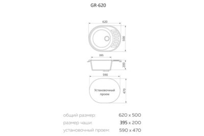 Мойка мрамор GR-620 чаша с крылом 620х500х200мм темно-серый (с сифоном) арт 620-309