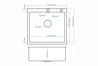 Кухонная мойка из пищевой нержавеющей стали имеет удобные и практичные размеры — 500х450 мм, глубина чаши составляет 220 мм. Отличается лаконичным современным дизайном, который подойдет к интерьеру в любом стиле. Верхняя площадка имеет толщину 3 мм, толщина стенок составляет 1,2 мм. Модель укомплектована сифоном, стационарным дозатором и коландером из нержавеющей стали.