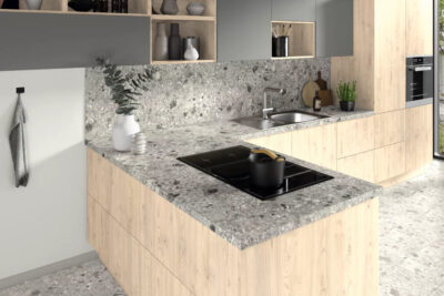 Столешница F021 ST75 Терраццо Триест серый 38мм/4100мм/600мм (Эггер) станет акцентной деталью интерьера благодаря выразительному декору — репродукции камня тераццо с увеличенным размером рисунка. Декор выполнен в сочетании серых тонов и органично сочетается с древесными панелями. Структура ST75 Минеральный сатин подчеркивает естественность декора и придает столешнице легкую бархатистость на ощупь.
