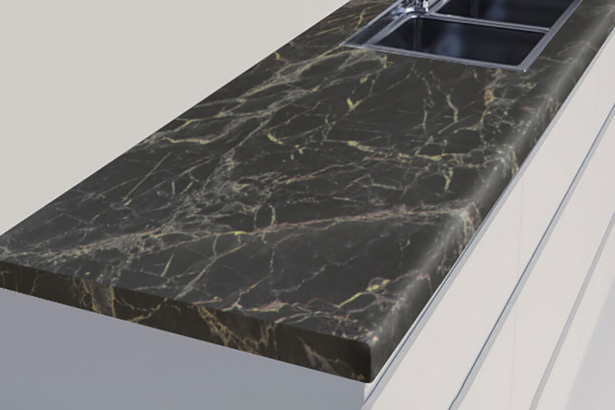 Столешница С508 Мрамор марквина черный 38мм/3050мм/600мм (Кроношпан) выполнена в выразительном декоре — репродукции черного мрамора. Контрастные светлые прожилки добавляют динамику и объем, золотистые вкрапления создают ощущение роскоши. Влагостойкая столешница 38 мм выполнена по технологии постформинг. ламинированная поверхность устойчива к повреждениям и выгоранию.
