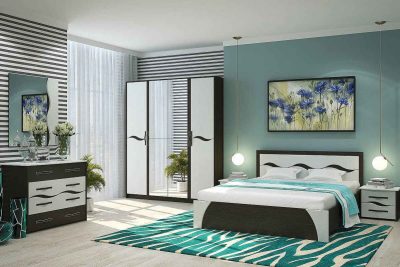 В этой спальне мы видим перед собой, прежде всего, удачное сочетание плавности линий и строгости вертикали. Фасады выполнены в цвете «Арктик» гармонично разбавляют темный корпус Венге. В состав спальни входят кровать с двумя прикроватными тумбочками, вместительный шкаф, имеющий как платяную часть, так и бельевую, объемный комод с четырьмя ящиками и зеркало.
